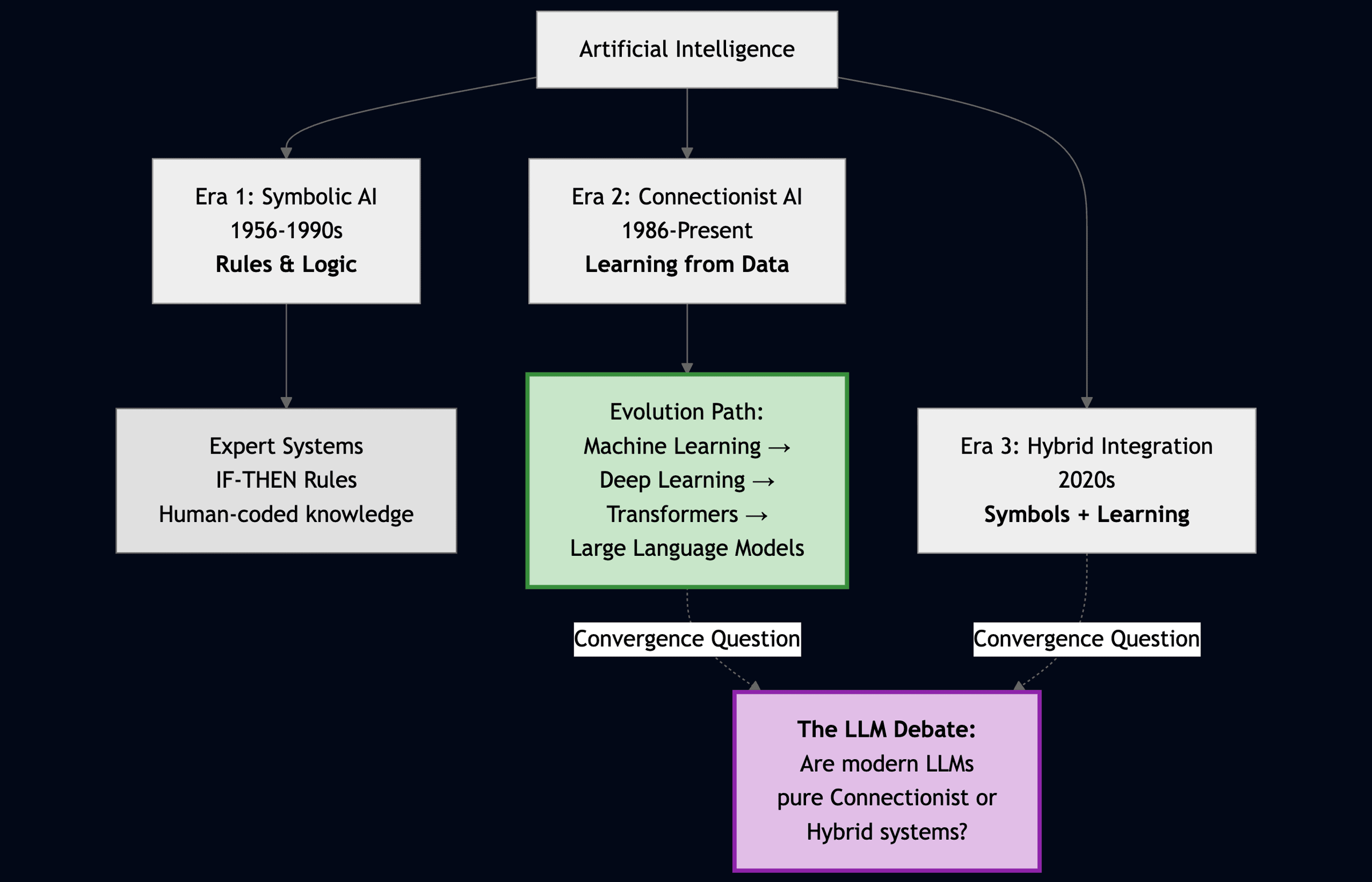 Simplification of the main branches of AI: Symbolic, Connectionist, and Hybrid.